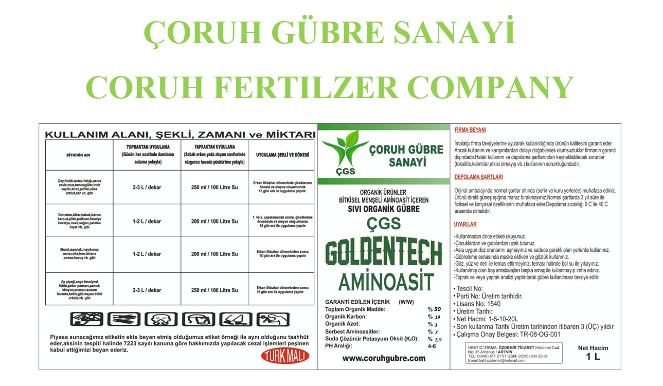 Firmamız olarak yapmış olduğumuz düzenli AR - GE çalışmaları neticesinde , yeni ürünümüz olan ÇGS - GOLDENTECH AMİNOASİT içeren Organik Sıvı Gübre